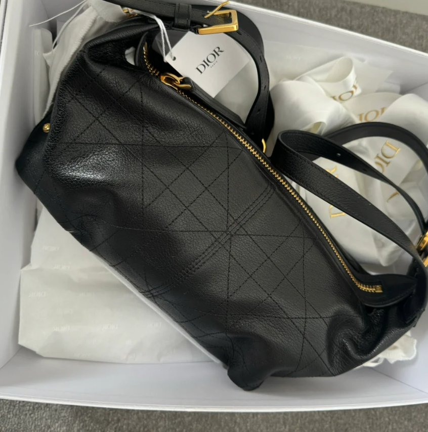 Decorative side pockets with leather pulls with antique gold-finish metal Christian Dior Paris signature