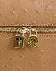 Two detachable, interchangeable, three-dimensional charms are included: a padlock reinforces the zipped closure, while the other is found inside the leather keychain